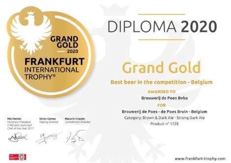 Brouwerij De Poes wint 2 gouden medailles op de Frankfurt International Trophy! De Poes Blond en Bruin scoorden elk het 'Grosses Gold", meteen de belangrijkste onderscheiding in hun categorie. En als kers op de taart werd De Poes Bruin verkozen als "Kategoriesieger" tot "Best Beer in the Competition - Belgium"